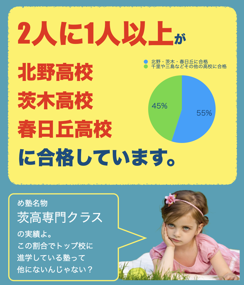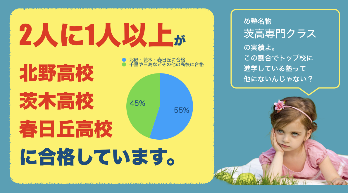 茨木高校・北野高校・春日丘高校などの地域TOP校を目指すために、め塾オリジナルの㊙︎カリキュラムを使って勉強するクラスです。